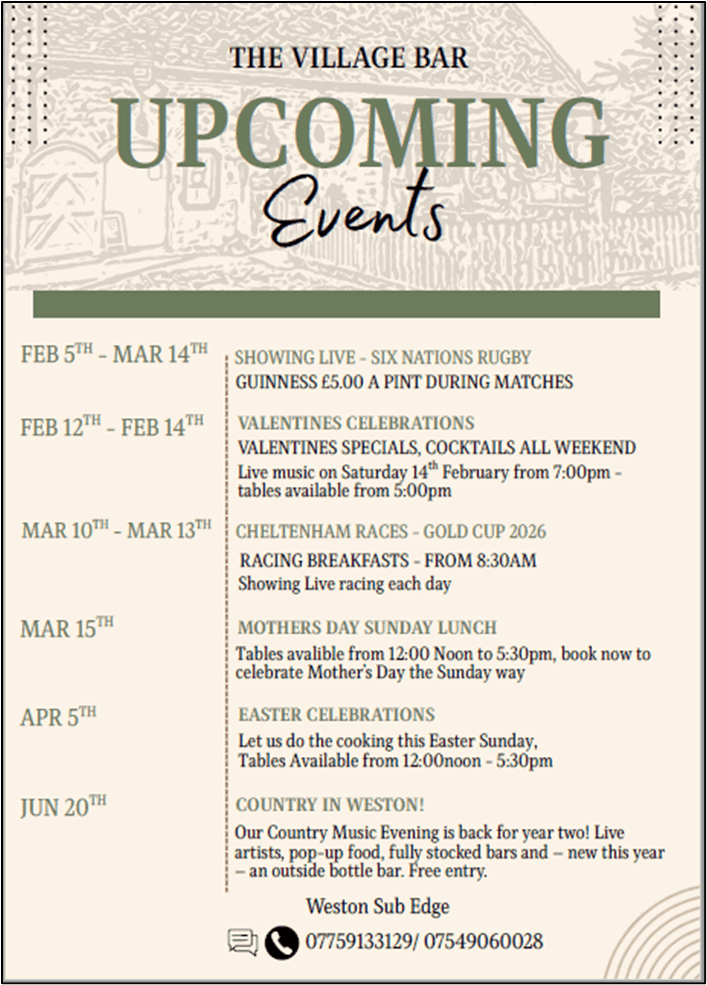 Events at the Village Bar, Weston sub Edge